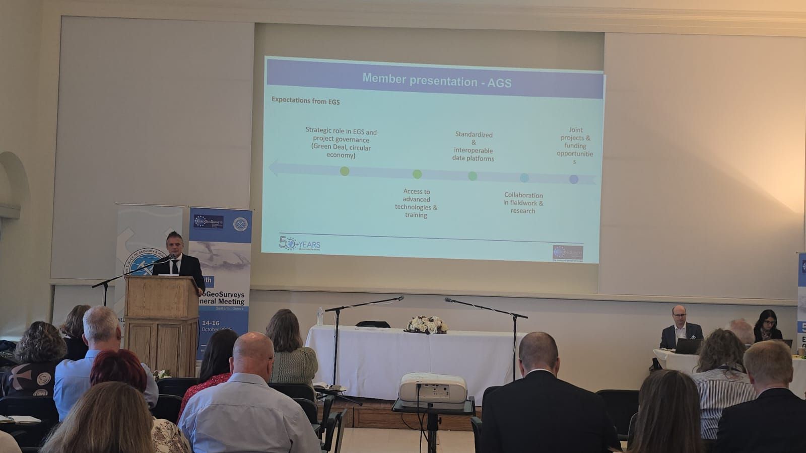 Drejtori i Përgjithshëm i SHGJSH, z. Adrian Bylyku, mbajti një prezantim mbi prioritetet sfidat në fushën e gjeoshkencave dhe bashkëpunimin me rrjetin evropian, duke theksuar rëndësinë e integrimit të Shqipërisë në projektet ndërkombëtare për burimet natyrore dhe zhvillimin e infrastrukturës së të dhënave gjeologjike.